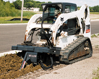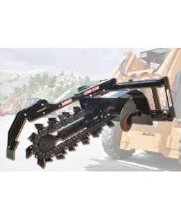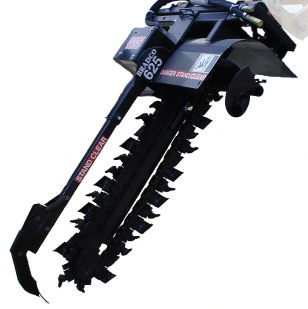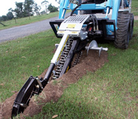 That means that nearly all of our bobcats in the 4, 5, and 6 class will work with a trencher. A bigger machine (5 or 6-foot) will provide more power (bigger engine) and faster cutting (chain spins faster due to higher hydraulic oil flow), but the advantage of a smaller machine (4-footer) is the less weight, and hence less damage to the exisiting lawn (and narrower for tighter access jobsites).